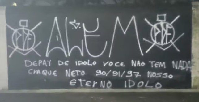 Uma das pichações afirma que Memphis “de ídolo não tem nada” e faz referência ao ex-jogador Neto, que tem feito críticas com frequência ao atleta.