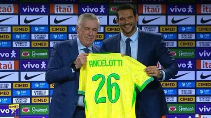 O técnico italiano Carlo Ancelotti foi apresentado como treinador da Seleção Brasileira. Depois de acertos e desacertos, Ancelotti aceitou assumir o comando da Seleção Brasileira e logo após o término de Lá Liga, onde comandava o Real Madrid, o técnico italiano veio para o Brasil para assumir a Seleção.