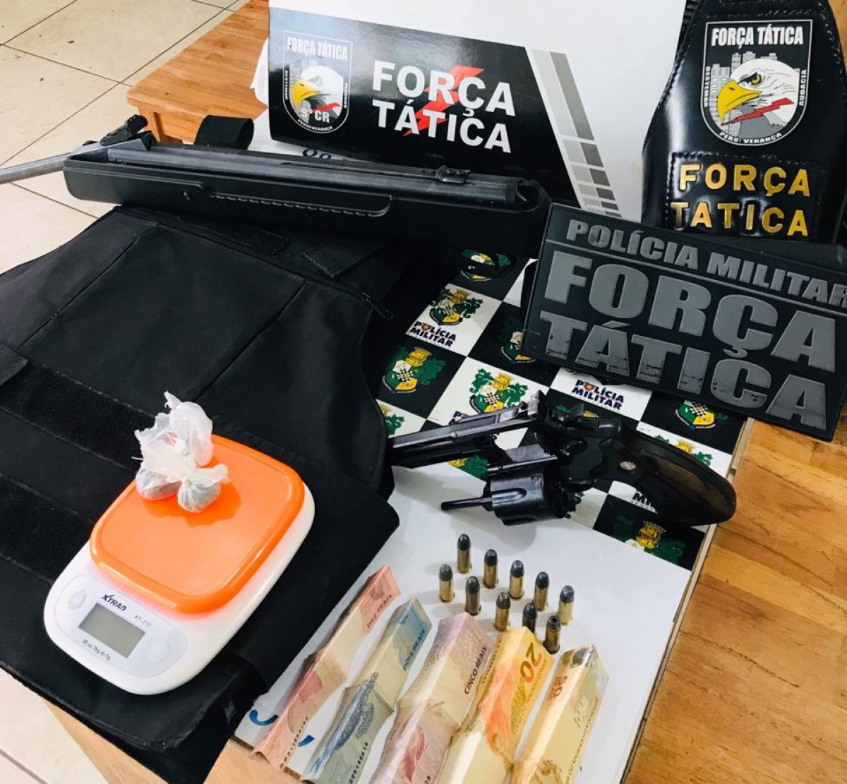 No interior da residência foi encontrado um revólver calibre 38, munições, duas porções de substância análoga a maconha, balança de precisão, um colete balístico e uma espingarda que será periciada.