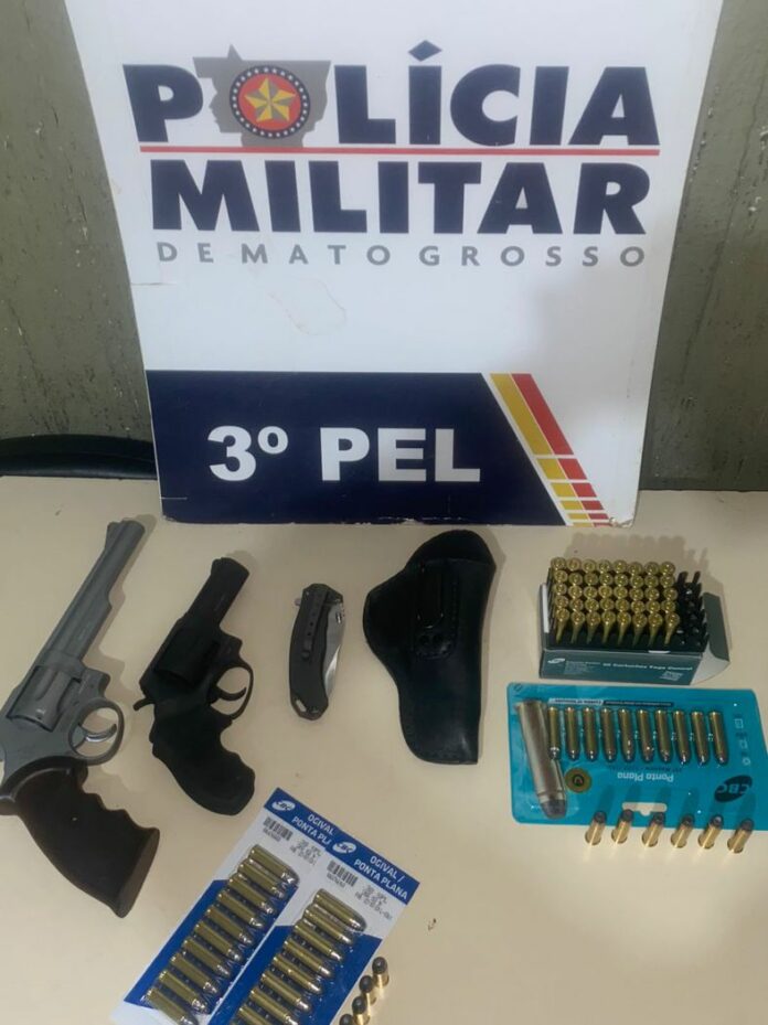 A PM quando foi acionada pela vítima confirmou a história com o cuinhado do suspeito e pediu a arma entregue pelas testemunhas, um revólver calibre 38 e munições. “Mas disseram que o suspeito na casa dele tinha outra arma assim como a esposa do suspeito também tem arma. Fomos até lá e encontramos o suspeito que não reagiu. Conversamos com a esposa dele que franqueou nossa entrada e apontou onde estava a outra arma, um revólver calibre 357”, contou a PM que ainda apreendeu farta munição de 357 e 38. “Quanto à arma da mulher do suspeito, essa apresentou documentação e como não estava envolvida no caso, não houve necessidade de apreensão”, esclareceu.