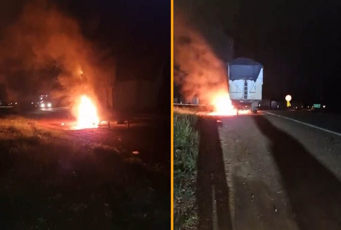 Motoristas que trafegavam pelo pela rodovia estadual registraram o momento em que o vagão de um veículo de carga pegava fogo.