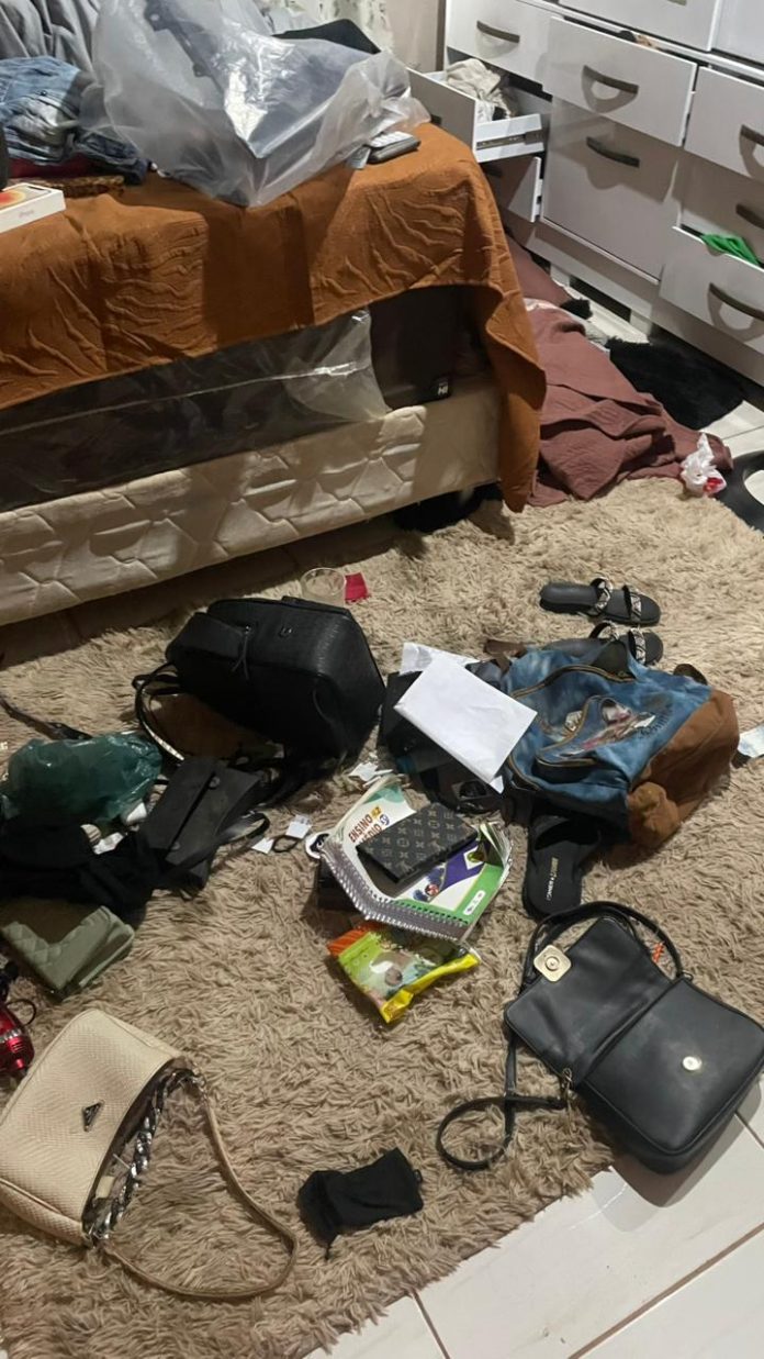 “Um cordão com pingente de duas meninas, 05 pares de argolas, 05 pares de brincos de bolinhas, 02 anéis de coração, 01 anel de ouro com pedra vermelha, 01 colar de ouro italiano, 01 cordão com 02 pingentes de criança, 01 anel de Nossa Senhora Aparecida com pedrinhas azuis, 01 brinco com pingente de árvore da vida, 01 colar com coração, 01 tornozeleira com olho grego, 01 brinco com 3 corações pendurados; 01 relógio pequeno, 01 relógio grande Apple, 02 relógios grandes, 02 correntes de prata masculina, 01 perfume Florata Real, 01 perfume Elysée Blanc. Também foi levada a quantia de R$1.200,00 em moeda corrente”.