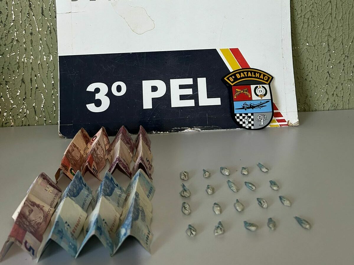 A Polícia Militar recebeu informação que o homem após sair da cadeia continuou traficando e quando o abordou, na frente de sua casa fez a busca pessoa e dentro da carteira de cigarro do suspeito encontrou sete porções de entorpecente. Depois, numa busca dentro da residência, escondido no buraco de tijolo na parede, achou mais 13 porções de pasta base de cocaína, prontas para comercialização.