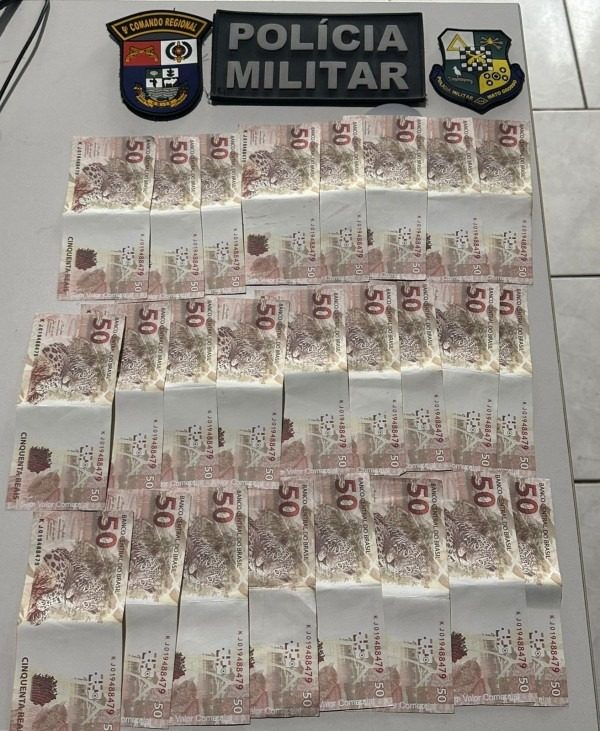 A PM recebeu a denúncia de que uma pessoa estava com grande volume em notas de 5 reais não verdadeiras tentando trocar por outras cédulas. Quando avistou a suspeita os militares fizeram a abordagem e encontraram com ela pelo menos 25 notas de 50 reais falsas. Ela contou que não sabia da falsificação segundo a PM e ainda acrescentou que o filho lhe entregou o dinheiro para fazer a troca.
