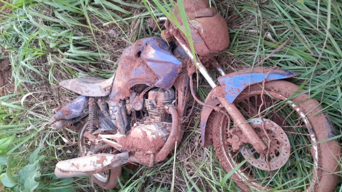 A motocicleta também, além de muito suja de lama devido ao local onde foi encontrada, está destruída, com tanque amassado, quadro torto, guidão contorcido, entre outras avarias. “Encaminhamos para a Delegacia de Alta Floresta onde provavelmente deve passar por perícia”, comentou sargento Gilson, comandante da Polícia Militar de Carlinda.