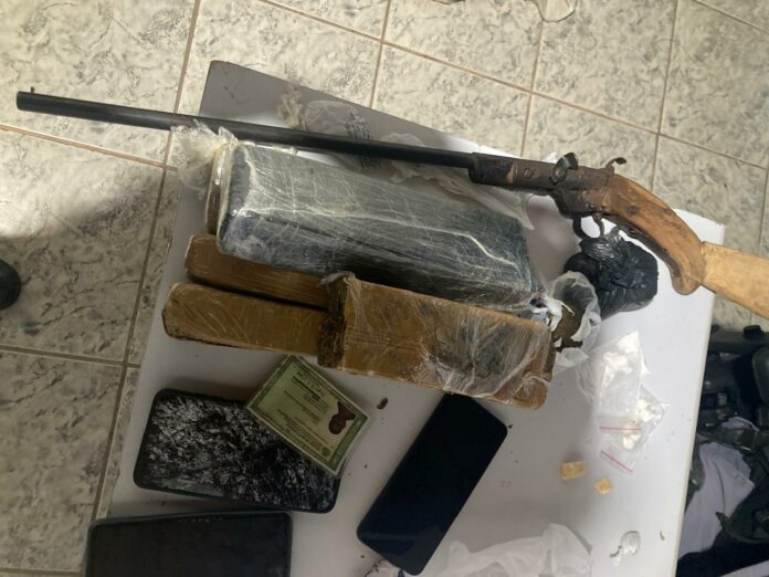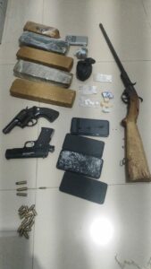 Os policiais militares desenterraram a droga que estava em sacolas plásticas. Mas ainda foram apreendidos outros materiais como balança de precisão, celulares e as armas sendo uma espingarda, um revólver calibre 38 e uma pistola calibre 380.