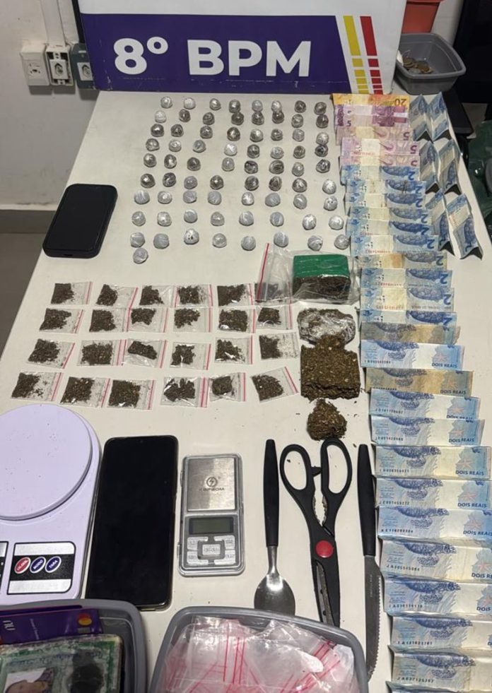 Mas a quantidade maior estava na casa de um deles onde uma mulher de 28 anos foi presa também. E no local a PM apreendeu mais grande quantidade de entorpecente e material para embalagem, além de balança de precisão.