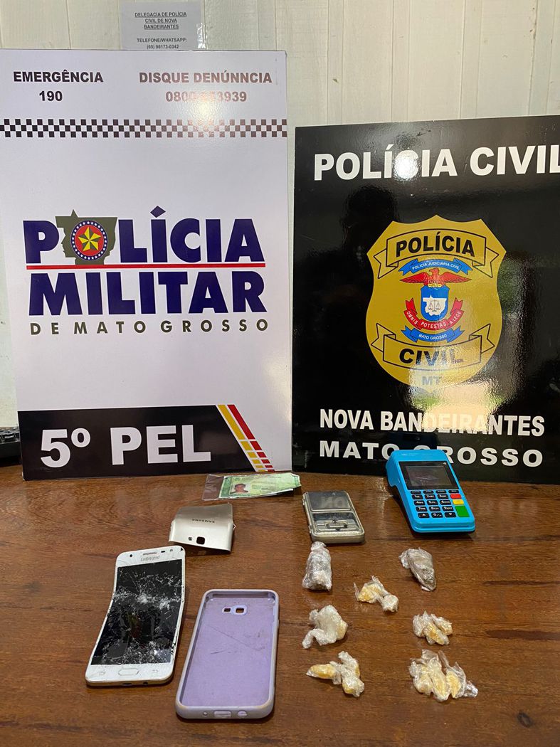 Na casa também foi encontrada balança de precisão e uma máquina de cartão. Todo o material encaminhado à Delegacia de Polícia Civil para investigação.