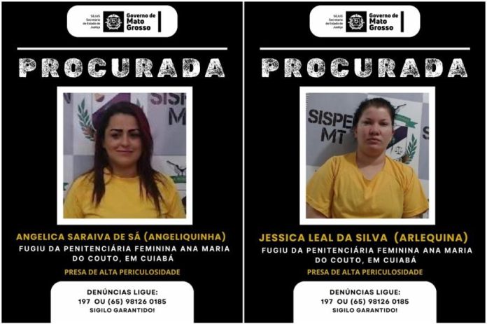 Duas criminosas fugiram da Penitenciária Feminina Ana Maria do Couto May, em Cuiabá, na madrugada deste domingo (17). As Forças de Segurança fazem buscas para encontrá-las. A primeira foi identificada como Angelica Saraiva de Sá, de 34 anos, conhecida como ‘Angeliquinha’, líder criminosa do norte do Estado, condenada a mais de 250 anos de prisão por homicídio, tráfico de drogas e organização criminosa.