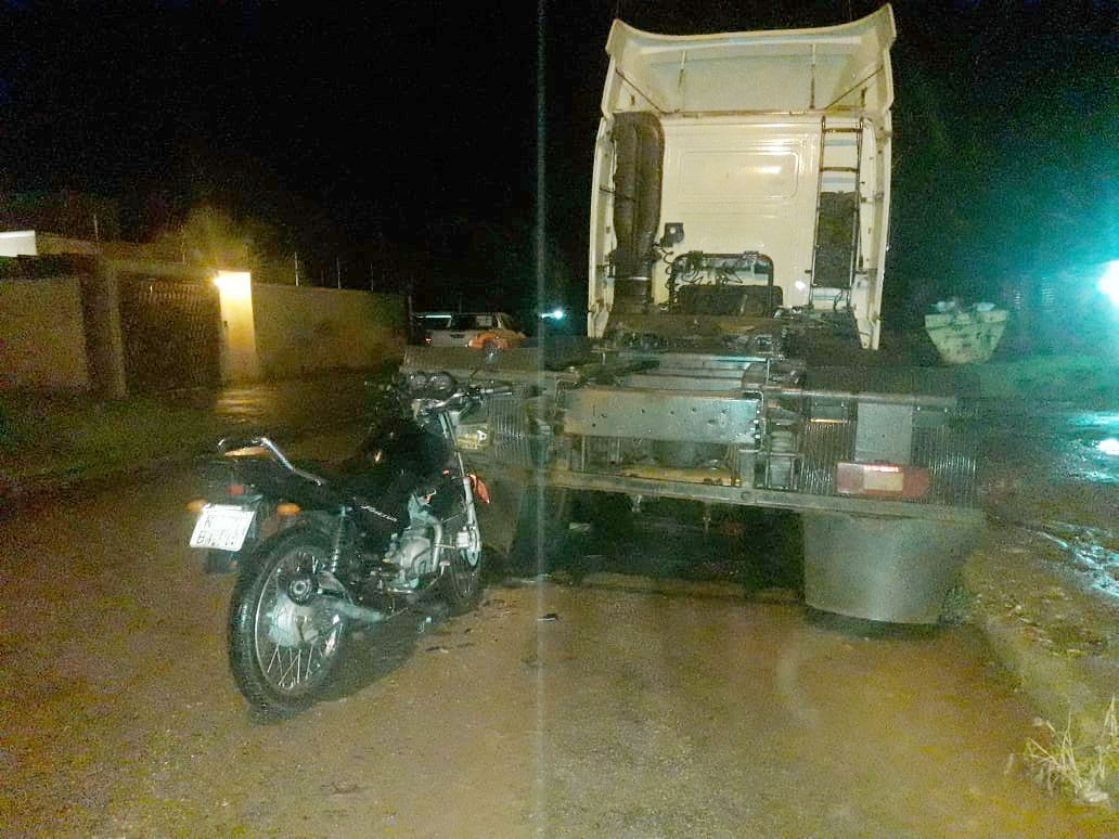 Motocicleta da vítima ficou grudada na traseira do ‘cavalo’ de caminhão