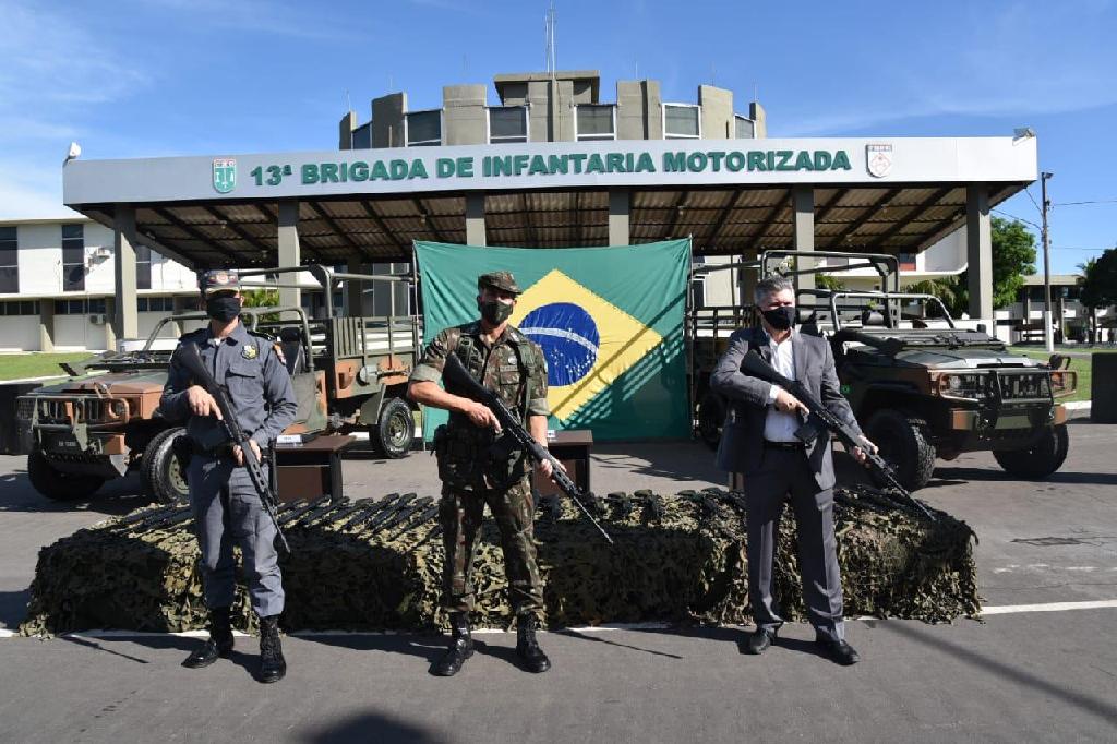 Na manhã desta quinta-feira (23.04), em um ato simbólico, o secretário de Segurança Pública, Alexandre Bustamante, e o comandante geral da Polícia Militar, coronel Jonildo José de Assis, receberam do Comando da 13ª Brigada de Infantaria Motorizada do Exército Brasileiro, com sede em Cuiabá, 30 fuzis modelo FAL 7,62mm.