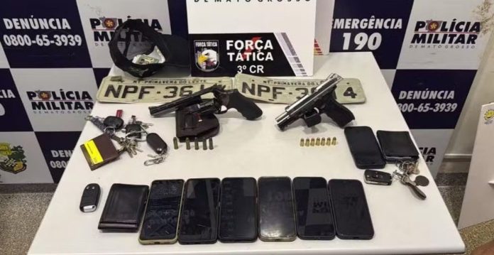 No carro foram encontrados um revólver com cinco munições intactas no assoalho, duas placas veiculares e sete celulares. A PM constatou que o veículo ainda estava com a placa original.