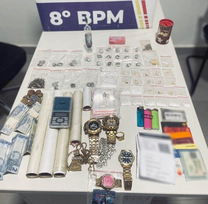 Na busca feita no local foram apreendidos os seguintes produtos: nove porções de cocaína, um lança perfume, três ecstasy, 16 porções de pasta base de cocaína, 28 porções de maconha, uma balança de precisão, material para embalar droga e cinco telefones celulares.