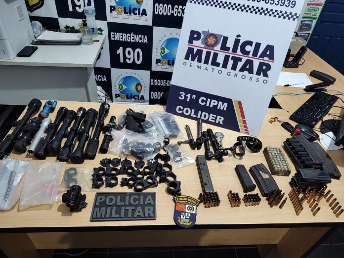 Polícia Militar, ao tomar conhecimento da informação, foi ao endereço, fez o cerco e ainda encontrou um suspeito dentro da residência que estava toda revirada. “Ao chegar no local do fato observamos que a residência tinha sinais de arrombamento e ao fazer o adentramento localizamos o suspeito e em um lençol haviam diversos carregadores, munições, lunetas, dentre outros materiais”, informou a PM