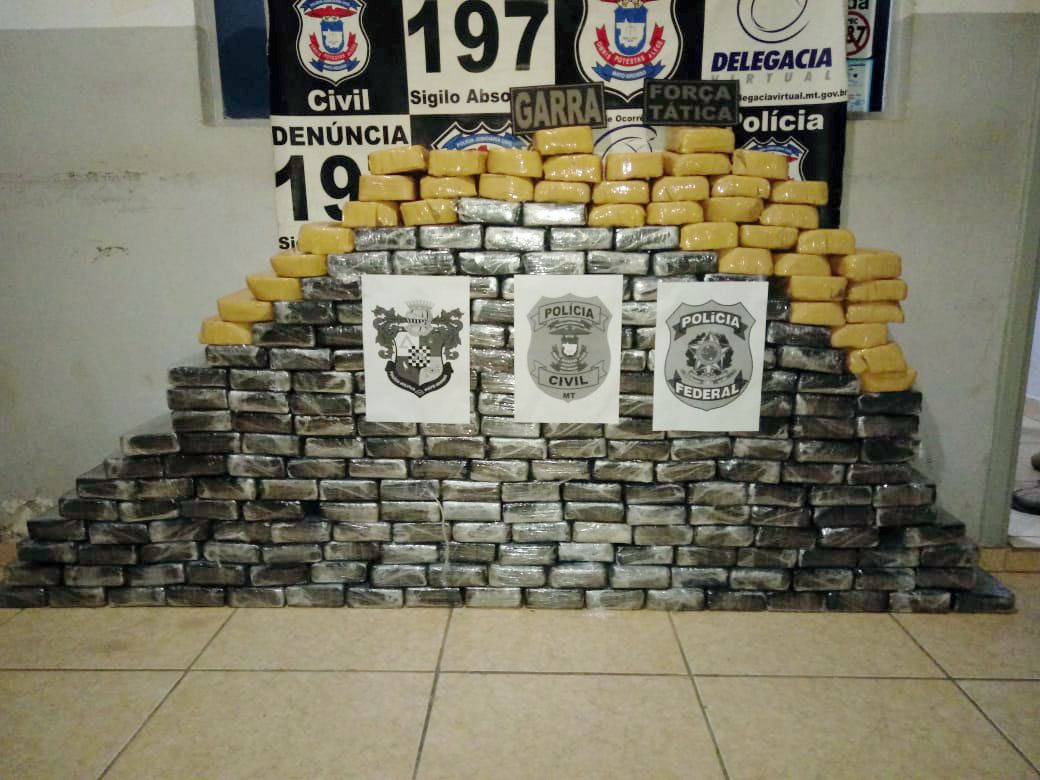 Alta Floresta/MT – A maior apreensão de droga na cidade de Nova Bandeirantes foi registrada final de semana. Uma operação integrada das Polícia Civil, Militar e apoio da Polícia Federal resultou em 259 quilos de entorpecente. São 200 tabletes de cocaína pura e mais 41 tabletes de pasta base. O material estava armazenado em uma fazenda, escondido dentro de um buraco revestido com tabuas e folhas para camuflar o cenário.