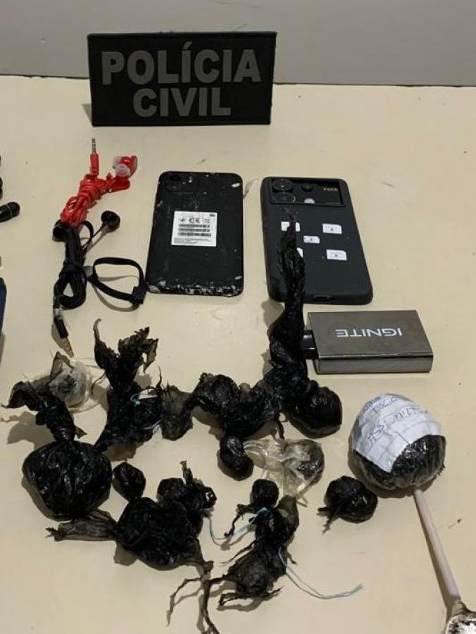 Durante a busca e apreensão, foram localizados aparelhos celulares, chips de telefone, diversas porções de entorpecentes, anotações do tráfico e provas de crimes de estelionato.