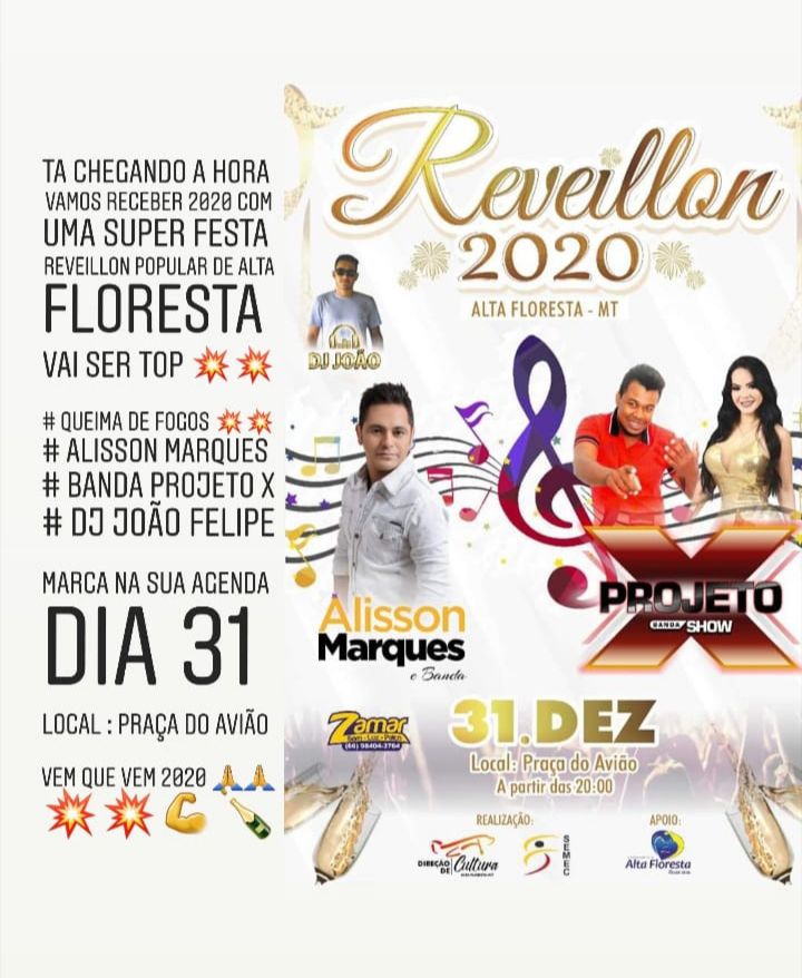 Alta Floresta/MT – Uma grande festa é preparada à população do município de Alta Floresta para a passagem de ano. Através do Departamento de Cultura e Juventude, será realizado o Reveillon Popular, evento com diversas atrações como o cantor Alisson Marques, Banda Projeto X, DJ João Felipe e queima de fogos.