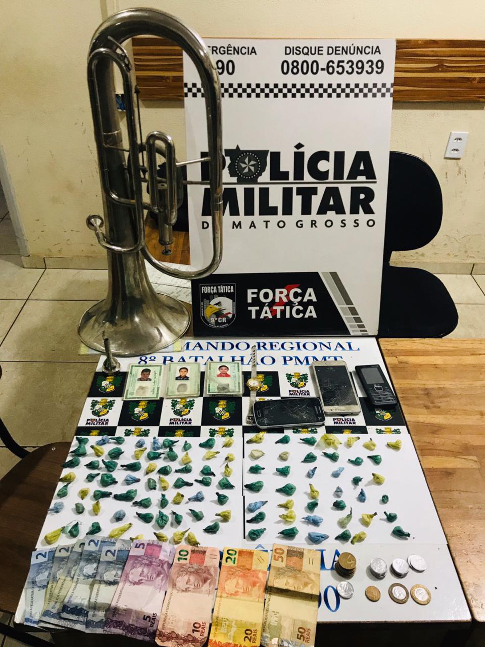 Alta Floresta/MT – Um menor de 14 anos, além de três maiores, de 20 (2) e 23 anos, foram detidos pela Polícia Militar em alta Floresta numa ação contra o tráfico de drogas. O trabalho resultou ainda na apreensão de pelo menos 109 porções de pasta base de cocaína, todas prontas para serem comercializadas. Um fato que chamou atenção foi também um instrumento musical, uma corneta que seria usada como o toque da boca, anunciando o produto.