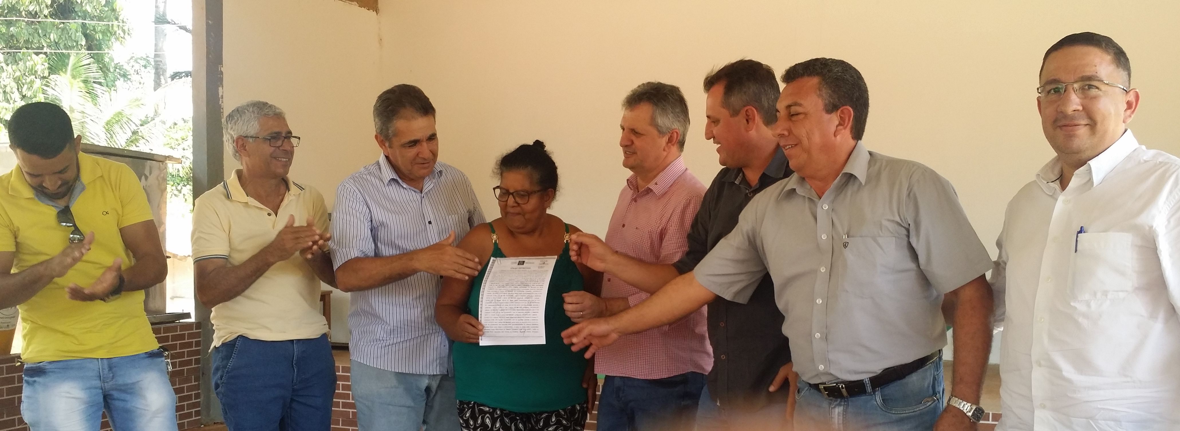 Acompanhado do diretor de regularização agrária rural Jeovah Feliciano de Souza, o presidente do INTERMAT Francisco Serafim de Barros, entregou pessoalmente o documento de posse à moradora Neide.