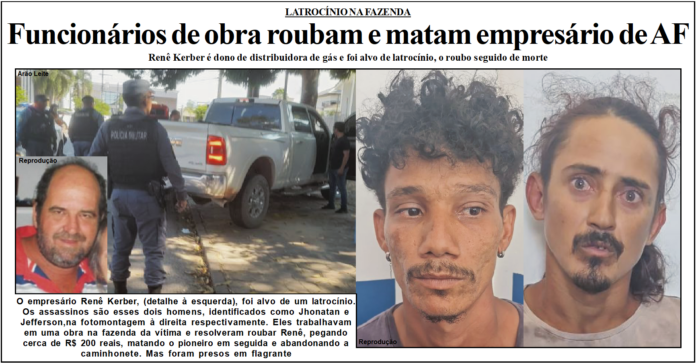 Alta Floresta – Renê Kerber, dono de uma das maiores distribuidoras de gás da região de Alta Floresta, foi vítima de latrocínio. Dois homens, identificados como Jhonatan Roberto dos Santos, de 31 anos, e Jefferson dos Santos Pinheiro, de 35 anos, confessaram o crime. Os dois foram presos em uma ação conjunta das Polícias Civil e Militar. Conforme os delegados Thiago Marques e Marcos Vinícius e o tenente coronel Alessandro, os assassinos mataram o empresário durante execução de um plano de roubo.