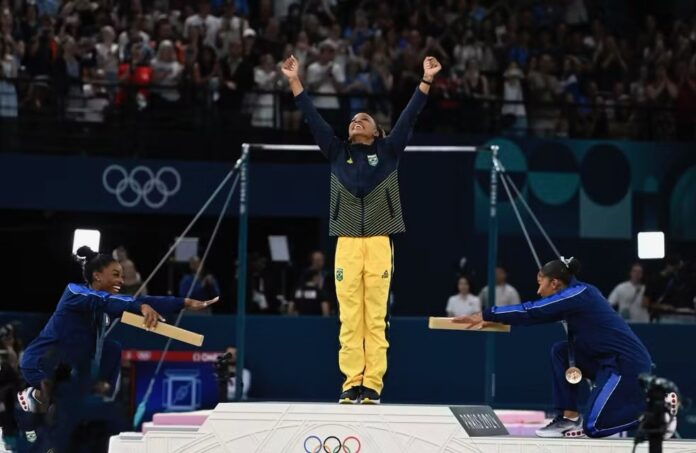 Foi um dia de emoção e redenção. Rebeca havia falhado na final de trave menos de uma hora antes, com a pontuação ficaria fora do pódio. Mas levantou a cabeça e entregou tudo no tablado, com um solo belíssimo, chegadas praticamente cravadas ao fim de cada acrobacia e as lágrimas de quem sabia que havia encerrado sua participação nas Olimpíadas de Paris com uma apresentação de encantar o mundo todo e digna de medalha. Simone Biles fez acrobacias incríveis, mas falhas na execução a deixaram com a medalha de prata. A americana Jordan Chiles ficou com o bronze.