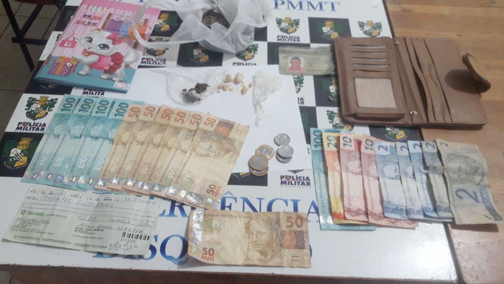 O cenário naquele momento parecia somente uso de bebida alcoólica, mas os policiais fizeram uma busca e encontraram porções de maconha, pasta base de cocaína e ainda dinheiro com os suspeitos. “Um deles falou que havia comprado a droga do marido dessa jovem”, comentou Sargento Bento, da Força Tática, alegando que o indivíduo apontado já tem várias passagens pela polícia.