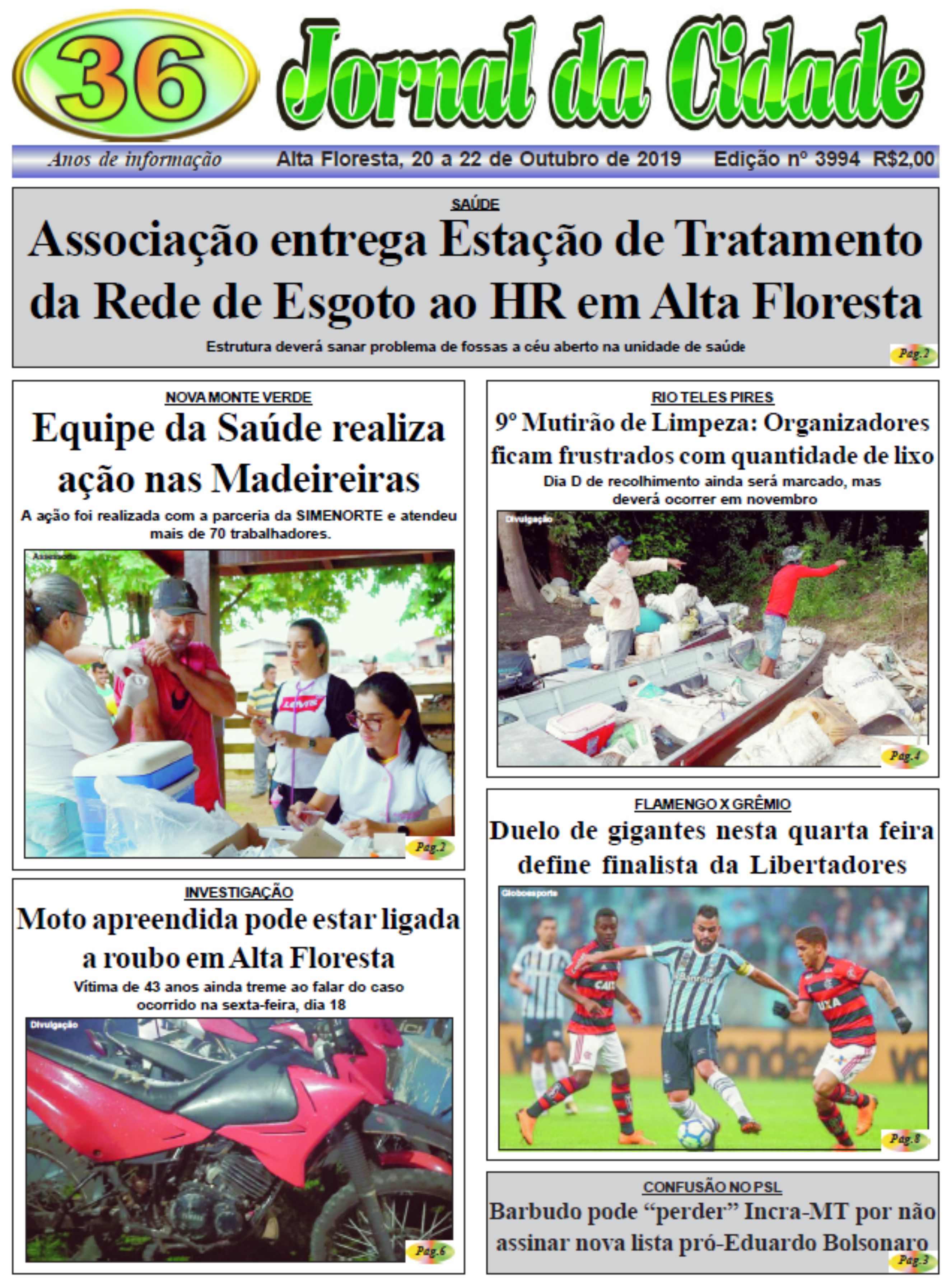 Edições do Jornal Edição 3994 22 de outubro de 2019 Compartilhe: FacebookTwitterPinterestWhatsApp Edição 3994 Artigo anteriorBarranco presidente do PT/MTPróximo artigoINVESTIGAÇÃO: Moto apreendida pode estar ligada a roubo em Alta Floresta Alta Floresta nublado enter location 22 ° C 22 ° 22 ° 98 % 0.7kmh 96 % sáb 29 ° dom 24 ° seg 28 ° ter 29 ° qua 29 ° Últimas notícias QUASE TRAGÉDIA EM NOVA BANDEIRANTES: Tiro acidental atinge filha de homem que fazia manutenção em arma Polícia Amanda, linda Social Beatriz, se destaca em nossa coluna social com sorriso lindo Social INTEGRANTE DE FACÇÃO: Menor é detido com maconha, pasta base e cocaína em Alta Floresta Polícia Erisvania, uma excelente maquiadora Social Artigos relacionados Geral MODELO DE GESTÃO: Mais 15 escolas aprovam conversão para gestão cívico-militar e Rede Estadual passa a contar com 223 unidades em MT Laís Soares | Seduc-MT A Rede Estadual de Ensino de Mato Grosso agora passa a contar com 223 escolas... Polícia QUASE TRAGÉDIA EM NOVA BANDEIRANTES: Tiro acidental atinge filha de homem que fazia manutenção em arma Por Arão Leite Alta Floresta – A Polícia Civil apura um caso de disparo acidental que quase termina em... Social Amanda, linda Social Beatriz, se destaca em nossa coluna social com sorriso lindo