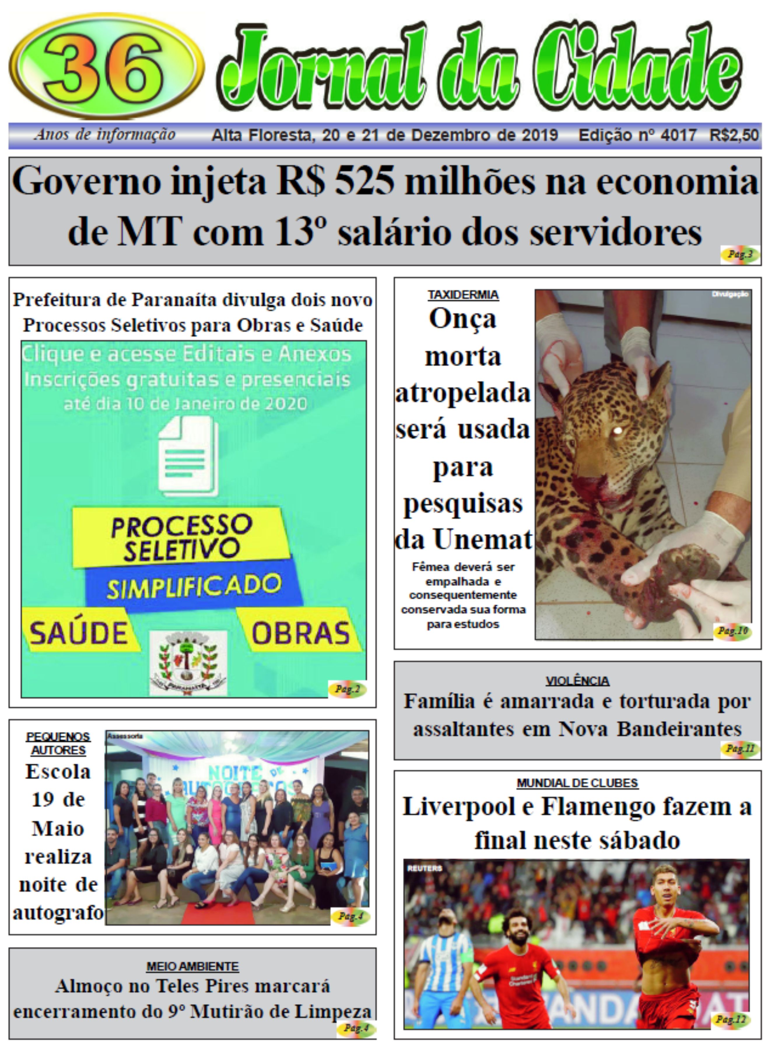 Edições do Jornal Edição 4017 21 de dezembro de 2019 Compartilhe: FacebookTwitterPinterestWhatsApp Edição 4017 Artigo anteriorLúcia Mendes completou mais um ano de vida na quarta-feira dia 18 com muita gratidão .Próximo artigoJanaina sobre Taques: “Má gestão é tão danosa quanto corrupção” Alta Floresta nublado enter location 22.1 ° C 22.1 ° 22.1 ° 100 % 0.4kmh 100 % seg 25 ° ter 29 ° qua 29 ° qui 29 ° sex 29 ° Últimas notícias QUASE TRAGÉDIA EM NOVA BANDEIRANTES: Tiro acidental atinge filha de homem que fazia manutenção em arma Polícia Amanda, linda Social Beatriz, se destaca em nossa coluna social com sorriso lindo Social INTEGRANTE DE FACÇÃO: Menor é detido com maconha, pasta base e cocaína em Alta Floresta Polícia Erisvania, uma excelente maquiadora Social Artigos relacionados Geral MODELO DE GESTÃO: Mais 15 escolas aprovam conversão para gestão cívico-militar e Rede Estadual passa a contar com 223 unidades em MT Laís Soares | Seduc-MT A Rede Estadual de Ensino de Mato Grosso agora passa a contar com 223 escolas... Polícia QUASE TRAGÉDIA EM NOVA BANDEIRANTES: Tiro acidental atinge filha de homem que fazia manutenção em arma Por Arão Leite Alta Floresta – A Polícia Civil apura um caso de disparo acidental que quase termina em... Social Amanda, linda Social Beatriz, se destaca em nossa coluna social com sorriso lindo