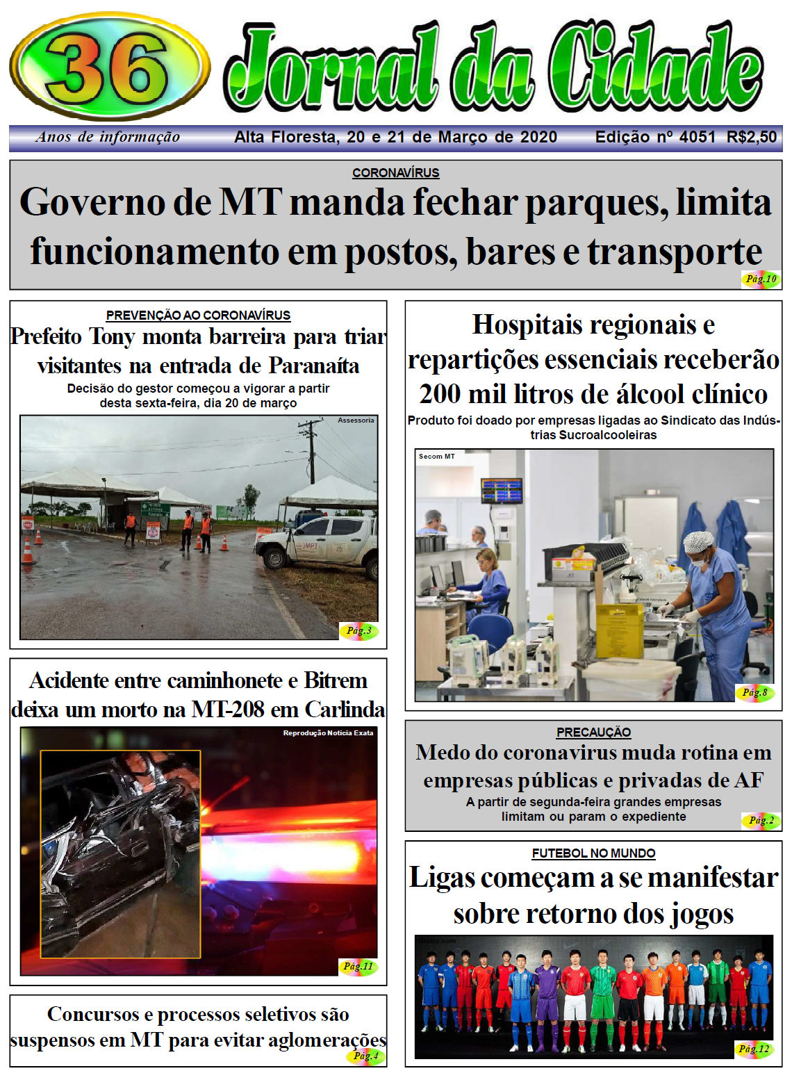 Edições do Jornal Edição 4051 21 de março de 2020 Compartilhe: FacebookTwitterPinterestWhatsApp Artigo anteriorPREVENÇÃO AO CORONAVÍRUS: Prefeito Tony monta barreira para triar visitantes na entrada de ParanaítaPróximo artigoCAMPEONATO MATO GROSSENSE: FMF acata determinação da CBF e adia as quartas de final Alta Floresta nublado enter location 20.8 ° C 20.8 ° 20.8 ° 98 % 1.8kmh 100 % qui 34 ° sex 29 ° sáb 29 ° dom 29 ° seg 29 ° Últimas notícias HOMEM QUE CAIU DE EMBARCAÇÃO: Bombeiros cessam buscas por turista desaparecido no Rio Juruena Polícia SÉRIE B: Cuiabá vence a primeira e sai do Z-4 Esporte PEDIRÁ VOTOS PARA EX-GOVERNADOR: Alckmin será cabo eleitoral de Taques na disputa ao Senado e agenda visita a MT Geral ACIDENTE DE TRABALHO: Homem cai de andaime e vai parar na UTI em AF Polícia SEM CITAR NOMES: Pivetta volta acusar senador de ‘negociata’ com prefeituras Geral Artigos relacionados Destaques NA ONDA BOLSONARISTA: Mauro diz que Flávio Bolsonaro é herdeiro da direita e sinaliza apoio Pablo Rodrigo Gazeta Digital O ex-governador Mauro Mendes (União) classificou o senador Flávio Bolsonaro (PL-RJ), como o ‘herdeiro’ da direita... Polícia HOMEM QUE CAIU DE EMBARCAÇÃO: Bombeiros cessam buscas por turista desaparecido no Rio Juruena Por Arão Leite Alta Floresta – Foram cessadas por parte do Corpo de Bombeiros, as buscas ao turista Marcelo... Esporte SÉRIE B: Cuiabá vence a primeira e sai do Z-4 Gustavo Sampaio Jornal da Cidade O Dourado venceu sua primeira partida na Série B 2026. O triunfo veio contra o... Geral PEDIRÁ VOTOS PARA EX-GOVERNADOR: Alckmin será cabo eleitoral de Taques na disputa ao Senado e agenda visita a MT Fred Moraes Gazeta Digital Vice-presidente da República e uma das principais lideranças nacionais do Partido Socialista Brasileiro (PSB), Geraldo Alckmin...