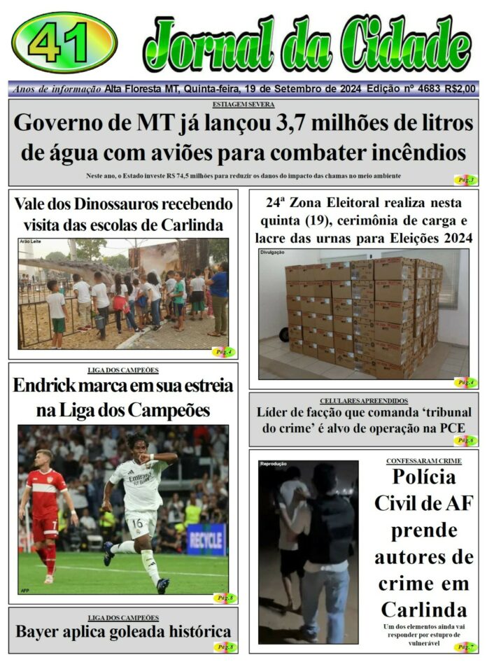 Edições do Jornal Edição 4683 19 de setembro de 2024 Compartilhe: FacebookTwitterPinterestWhatsApp Loading... Taking too long? Reload document | Open in new tab Artigo anteriorAlta Floresta Mais de 470 mesários são convocados para atuar nas eleições 2024Próximo artigoOperação Código Seguro Suspeito de tentar invadir sistema da Polícia Civil é alvo de operação em SP Alta Floresta nuvens quebradas enter location 22.5 ° C 22.5 ° 22.5 ° 96 % 1.3kmh 69 % qui 34 ° sex 29 ° sáb 28 ° dom 28 ° seg 24 ° Últimas notícias HOMEM QUE CAIU DE EMBARCAÇÃO: Bombeiros cessam buscas por turista desaparecido no Rio Juruena Polícia SÉRIE B: Cuiabá vence a primeira e sai do Z-4 Esporte PEDIRÁ VOTOS PARA EX-GOVERNADOR: Alckmin será cabo eleitoral de Taques na disputa ao Senado e agenda visita a MT Geral ACIDENTE DE TRABALHO: Homem cai de andaime e vai parar na UTI em AF Polícia SEM CITAR NOMES: Pivetta volta acusar senador de ‘negociata’ com prefeituras Geral Artigos relacionados Destaques NA ONDA BOLSONARISTA: Mauro diz que Flávio Bolsonaro é herdeiro da direita e sinaliza apoio Pablo Rodrigo Gazeta Digital O ex-governador Mauro Mendes (União) classificou o senador Flávio Bolsonaro (PL-RJ), como o ‘herdeiro’ da direita... Polícia HOMEM QUE CAIU DE EMBARCAÇÃO: Bombeiros cessam buscas por turista desaparecido no Rio Juruena Por Arão Leite Alta Floresta – Foram cessadas por parte do Corpo de Bombeiros, as buscas ao turista Marcelo... Esporte SÉRIE B: Cuiabá vence a primeira e sai do Z-4 Gustavo Sampaio Jornal da Cidade O Dourado venceu sua primeira partida na Série B 2026. O triunfo veio contra o... Geral PEDIRÁ VOTOS PARA EX-GOVERNADOR: Alckmin será cabo eleitoral de Taques na disputa ao Senado e agenda visita a MT Fred Moraes Gazeta Digital Vice-presidente da República e uma das principais lideranças nacionais do Partido Socialista Brasileiro (PSB), Geraldo Alckmin...