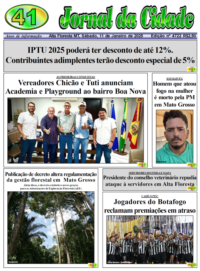 Edições do Jornal Edição 4722 11 de janeiro de 2025 Compartilhe: FacebookTwitterPinterestWhatsApp Loading... Taking too long? Reload document | Open in new tab Artigo anteriorIPTU: 2025 poderá ter desconto de até 12%. Contribuintes adimplentes terão desconto especial de 5%Próximo artigoNão deu: Vôlei Alta Floresta vence o primeiro set, mas equipe mineira vence Alta Floresta nublado enter location 22.6 ° C 22.6 ° 22.6 ° 99 % 1.5kmh 100 % seg 28 ° ter 29 ° qua 29 ° qui 29 ° sex 25 ° Últimas notícias QUASE TRAGÉDIA EM NOVA BANDEIRANTES: Tiro acidental atinge filha de homem que fazia manutenção em arma Polícia Amanda, linda Social Beatriz, se destaca em nossa coluna social com sorriso lindo Social INTEGRANTE DE FACÇÃO: Menor é detido com maconha, pasta base e cocaína em Alta Floresta Polícia Erisvania, uma excelente maquiadora Social Artigos relacionados Geral MODELO DE GESTÃO: Mais 15 escolas aprovam conversão para gestão cívico-militar e Rede Estadual passa a contar com 223 unidades em MT Laís Soares | Seduc-MT A Rede Estadual de Ensino de Mato Grosso agora passa a contar com 223 escolas... Polícia QUASE TRAGÉDIA EM NOVA BANDEIRANTES: Tiro acidental atinge filha de homem que fazia manutenção em arma Por Arão Leite Alta Floresta – A Polícia Civil apura um caso de disparo acidental que quase termina em... Social Amanda, linda Social Beatriz, se destaca em nossa coluna social com sorriso lindo