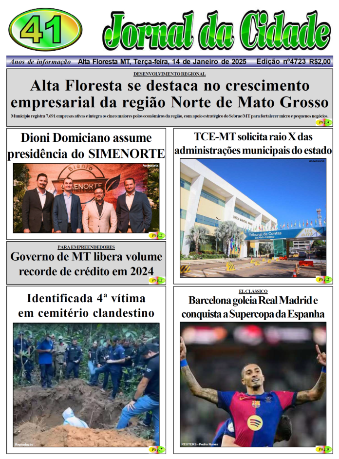 Edições do Jornal Edição 4723 14 de janeiro de 2025 Compartilhe: FacebookTwitterPinterestWhatsApp Loading... Taking too long? Reload document | Open in new tab Artigo anteriorSES alerta população sobre importância da prevenção e combate ao mosquito Aedes aegyptiPróximo artigoIdentificada 4ª vítima em cemitério clandestino Alta Floresta nuvens quebradas enter location 22.5 ° C 22.5 ° 22.5 ° 96 % 1.3kmh 69 % qui 34 ° sex 29 ° sáb 28 ° dom 28 ° seg 24 ° Últimas notícias HOMEM QUE CAIU DE EMBARCAÇÃO: Bombeiros cessam buscas por turista desaparecido no Rio Juruena Polícia SÉRIE B: Cuiabá vence a primeira e sai do Z-4 Esporte PEDIRÁ VOTOS PARA EX-GOVERNADOR: Alckmin será cabo eleitoral de Taques na disputa ao Senado e agenda visita a MT Geral ACIDENTE DE TRABALHO: Homem cai de andaime e vai parar na UTI em AF Polícia SEM CITAR NOMES: Pivetta volta acusar senador de ‘negociata’ com prefeituras Geral Artigos relacionados Destaques NA ONDA BOLSONARISTA: Mauro diz que Flávio Bolsonaro é herdeiro da direita e sinaliza apoio Pablo Rodrigo Gazeta Digital O ex-governador Mauro Mendes (União) classificou o senador Flávio Bolsonaro (PL-RJ), como o ‘herdeiro’ da direita... Polícia HOMEM QUE CAIU DE EMBARCAÇÃO: Bombeiros cessam buscas por turista desaparecido no Rio Juruena Por Arão Leite Alta Floresta – Foram cessadas por parte do Corpo de Bombeiros, as buscas ao turista Marcelo... Esporte SÉRIE B: Cuiabá vence a primeira e sai do Z-4 Gustavo Sampaio Jornal da Cidade O Dourado venceu sua primeira partida na Série B 2026. O triunfo veio contra o... Geral PEDIRÁ VOTOS PARA EX-GOVERNADOR: Alckmin será cabo eleitoral de Taques na disputa ao Senado e agenda visita a MT Fred Moraes Gazeta Digital Vice-presidente da República e uma das principais lideranças nacionais do Partido Socialista Brasileiro (PSB), Geraldo Alckmin...