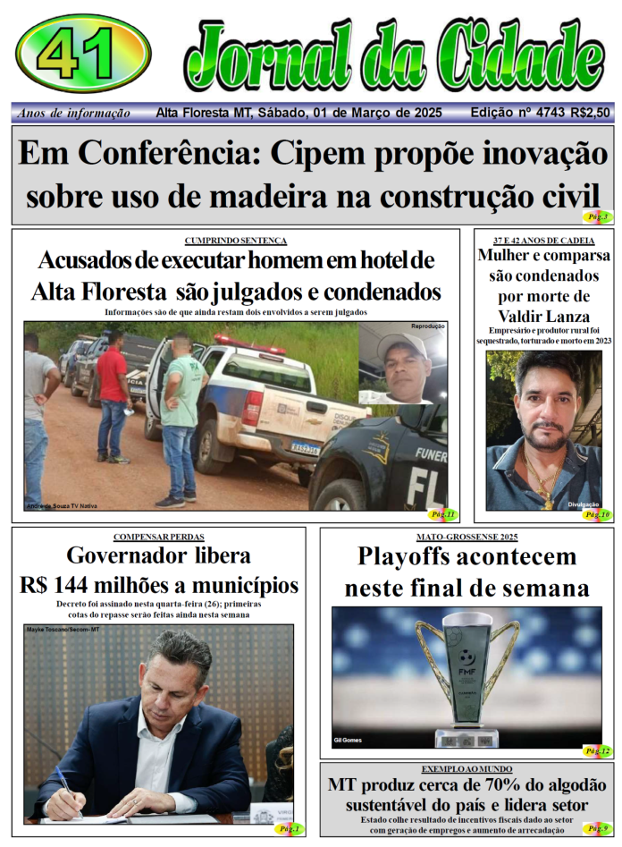 Edições do Jornal Edição 4743 1 de março de 2025 Compartilhe: FacebookTwitterPinterestWhatsApp Loading... Taking too long? Reload document | Open in new tab Artigo anteriorINCÊNDIOS FOLERESTAIS Governo Lula inclui MT em decreto de emergência ambientalPróximo artigoForagido Homem condenado por roubo e estelionato é preso em Paranaíta após furto de veículo Alta Floresta nuvens dispersas enter location 22.6 ° C 22.6 ° 22.6 ° 94 % 1.3kmh 42 % qui 28 ° sex 30 ° sáb 30 ° dom 30 ° seg 25 ° Últimas notícias REGIÃO DO SARARÉ: Mulher desaparece em área de garimpo e mobiliza buscas em MT Polícia CASO EM INVESTIGAÇÃO: Jovem vítima de afogamento vai parar na UTI em AF Destaques REGRESSÃO CAUTELAR: Polícia Civil prende condenado por matar homem com cano metálico Polícia EMERGÊNCIA AMBIENTAL: Governo de Mato Grosso publica decreto que estabelece período proibitivo de uso do fogo Geral CURVA DO RIO QUATRO PONTES: Mais uma vítima grave em choque frontal de veículos na MT-208 Polícia Artigos relacionados Esporte SUL-AMERICANA: Botafogo vence, Santos e São Paulo apenas empatam na 3ª rodada Gustavo Sampaio Jornal da Cidade O Botafogo manteve a liderança do Grupo E ao se impor frente ao Independiente Petrolero... Polícia REGIÃO DO SARARÉ: Mulher desaparece em área de garimpo e mobiliza buscas em MT Vithória Sampaio Gazeta Digital Mislene de Souza, 37, está desaparecida desde o último sábado (25), em uma área de garimpo... Destaques CASO EM INVESTIGAÇÃO: Jovem vítima de afogamento vai parar na UTI em AF Por Arão Leite Alta Floresta – Corpo de Bombeiros atendeu um caso de afogamento no município de Alta Floresta,... Polícia REGRESSÃO CAUTELAR: Polícia Civil prende condenado por matar homem com cano metálico Karina Cabral Polícia Civil - MT A Polícia Civil cumpriu, terça-feira (28.4), em Juara, um mandado de prisão de regressão...