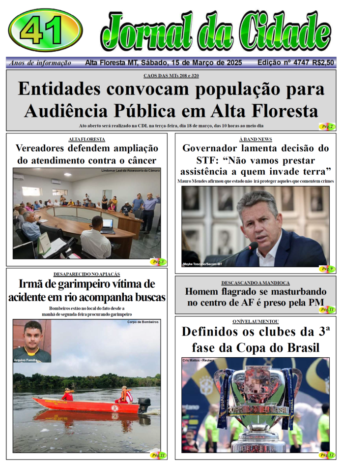 Edições do Jornal Edição 4747 15 de março de 2025 Compartilhe: FacebookTwitterPinterestWhatsApp Loading... Taking too long? Reload document | Open in new tab Artigo anteriorChipola, amante das aventuras em motos, cinquentou. Parabéns ChipolaPróximo artigoMato-Grossense: Semifinais acontecem neste sábado Alta Floresta nublado enter location 22.3 ° C 22.3 ° 22.3 ° 97 % 1kmh 100 % sáb 28 ° dom 25 ° seg 27 ° ter 28 ° qua 24 ° Últimas notícias QUASE TRAGÉDIA EM NOVA BANDEIRANTES: Tiro acidental atinge filha de homem que fazia manutenção em arma Polícia Amanda, linda Social Beatriz, se destaca em nossa coluna social com sorriso lindo Social INTEGRANTE DE FACÇÃO: Menor é detido com maconha, pasta base e cocaína em Alta Floresta Polícia Erisvania, uma excelente maquiadora Social Artigos relacionados Geral MODELO DE GESTÃO: Mais 15 escolas aprovam conversão para gestão cívico-militar e Rede Estadual passa a contar com 223 unidades em MT Laís Soares | Seduc-MT A Rede Estadual de Ensino de Mato Grosso agora passa a contar com 223 escolas... Polícia QUASE TRAGÉDIA EM NOVA BANDEIRANTES: Tiro acidental atinge filha de homem que fazia manutenção em arma Por Arão Leite Alta Floresta – A Polícia Civil apura um caso de disparo acidental que quase termina em... Social Amanda, linda Social Beatriz, se destaca em nossa coluna social com sorriso lindo