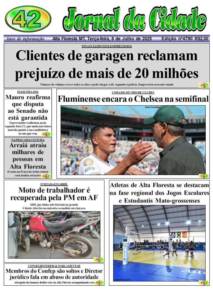 Edições do Jornal Edição 4790 8 de julho de 2025 Compartilhe: FacebookTwitterPinterestWhatsApp Loading... Taking too long? Reload document | Open in new tab Artigo anteriorVeja os períodos vencidos Emanuel pede 450 dias de licença prêmio na AL e adia retorno para setembro de 2026Próximo artigoTentando aproximação Alta Floresta chuva forte enter location 21.1 ° C 21.1 ° 21.1 ° 97 % 0.3kmh 38 % ter 34 ° qua 28 ° qui 30 ° sex 29 ° sáb 25 ° Últimas notícias QUASE TRAGÉDIA EM NOVA BANDEIRANTES: Tiro acidental atinge filha de homem que fazia manutenção em arma Polícia Amanda, linda Social Beatriz, se destaca em nossa coluna social com sorriso lindo Social INTEGRANTE DE FACÇÃO: Menor é detido com maconha, pasta base e cocaína em Alta Floresta Polícia Erisvania, uma excelente maquiadora Social Artigos relacionados Geral MODELO DE GESTÃO: Mais 15 escolas aprovam conversão para gestão cívico-militar e Rede Estadual passa a contar com 223 unidades em MT Laís Soares | Seduc-MT A Rede Estadual de Ensino de Mato Grosso agora passa a contar com 223 escolas... Polícia QUASE TRAGÉDIA EM NOVA BANDEIRANTES: Tiro acidental atinge filha de homem que fazia manutenção em arma Por Arão Leite Alta Floresta – A Polícia Civil apura um caso de disparo acidental que quase termina em... Social Amanda, linda Social Beatriz, se destaca em nossa coluna social com sorriso lindo